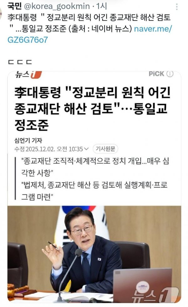 이 대통령정교분리원칙어긴 종교재단해산검토"…•통일교 정조준